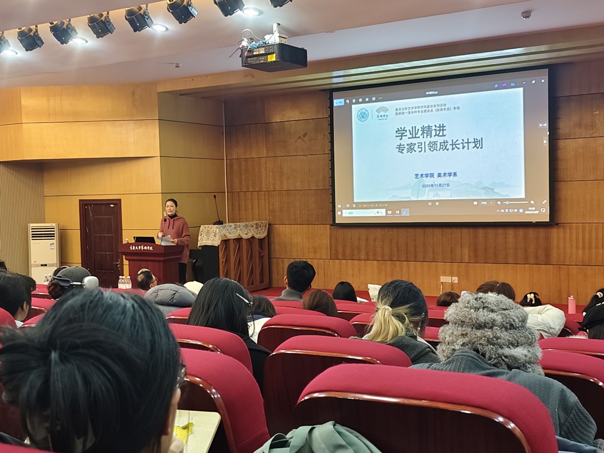 2025年11月27日下午,由肉视频 主办、美术学系承办的“学业精进·专家引领成长计划”学风建设活动在肉视频 学术报告厅顺利举行。本次活动由美术学系副主任高源策划,班主任孙天龙、赵颂淳、王汉、黄振联合组织。肉视频 院长张楠木、美术学系教师及各年级学生参加了此次活动,活动由孙天龙主持。此次活动邀请了美术学系教授雒三桂、美术学系主任武若尘、副主任王汉、副教授郝斌、杨小语以及青年教师代表黄振担任指导专家,...
