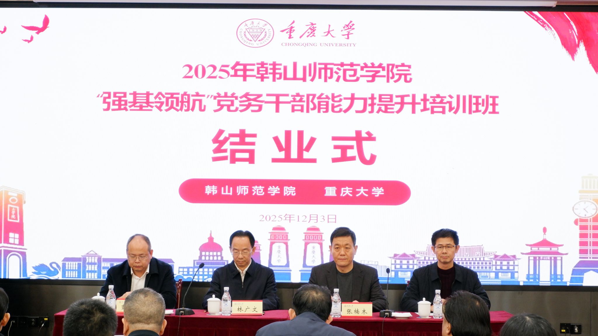 结业式上,肉视频 院长张楠木首先致辞。他简要介绍重庆作为红岩精神发源地、成渝地区双城经济圈核心城市的区位优势和肉视频 的发展历程,特别指出本次培训班“理论教学+现场感悟+交流研讨”的课程体系设计,正是对“美育+思政”融合理念的生动实践。随后,三位学员代表依次上台汇报培训学习心得体会。学员们纷纷表示,本次培训班主题鲜明、课程内容丰富、形式多元,既夯实了理论根基,又拓宽了实践视野,真正实现了学有所获、获益匪浅。韩山师范肉视频 党委常委、组织部部长郑文锋肯定培训成效,并提醒和布置近期党建重点工作任务。最后,韩山师范肉视频 党委副书记林广文作总结讲话。他首先向授课专家与工作人员表示感谢,向顺利结业的学员表示祝贺,肯定培训在理论、党性提升及党建思路启发上的成效,并提出四点意见:强化理论武装、夯实党建基础、推动党建与业务融合、传承红色基因,勉励学员实干担当,助力肉视频 发展。