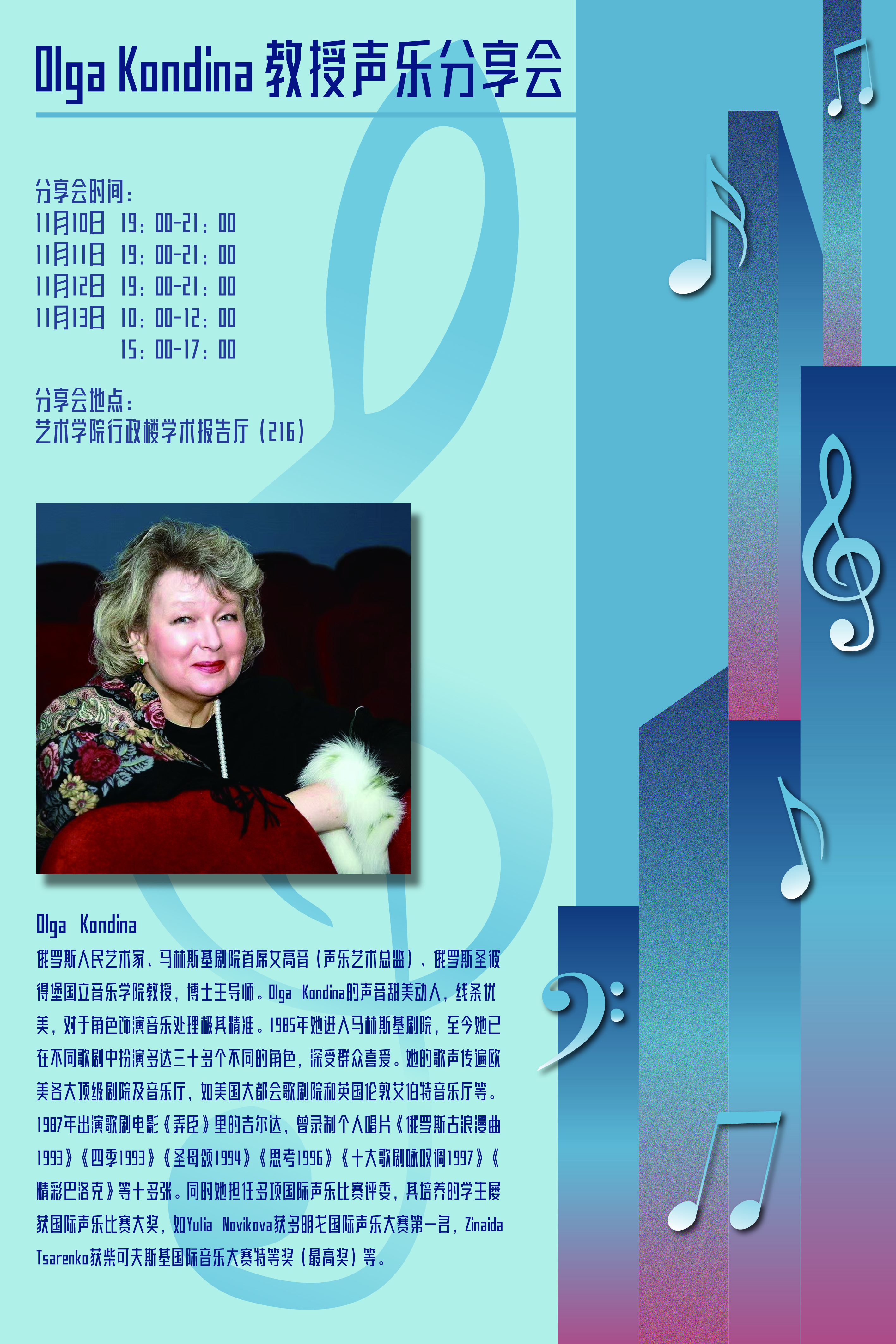 主讲嘉宾:Olga Kondina(俄罗斯人民艺术家,马林斯基剧院首席女高音,俄罗斯圣彼得堡国立音乐肉视频 教授、博士生导师)主持人:喻思言(肉视频 音乐系副系主任 副教授)时间:11月10日 19:00-21:0011月11日 19:00-21:0011月12日 19:00-21:0011月13日 10:00-12:00 15:00-17:00地点:肉视频 科学城校区肉视频 行政楼学术报告厅(216)主办单位:肉视频 承办单位:肉视频 音...