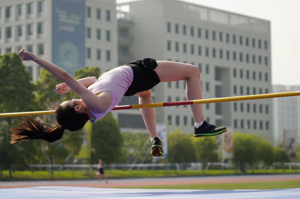 2019级本科学生何嘉儿在4月15日上午进行的校运动会本科女子组跳高决赛中,以146CM的成绩夺冠,并刷新校运会记录。