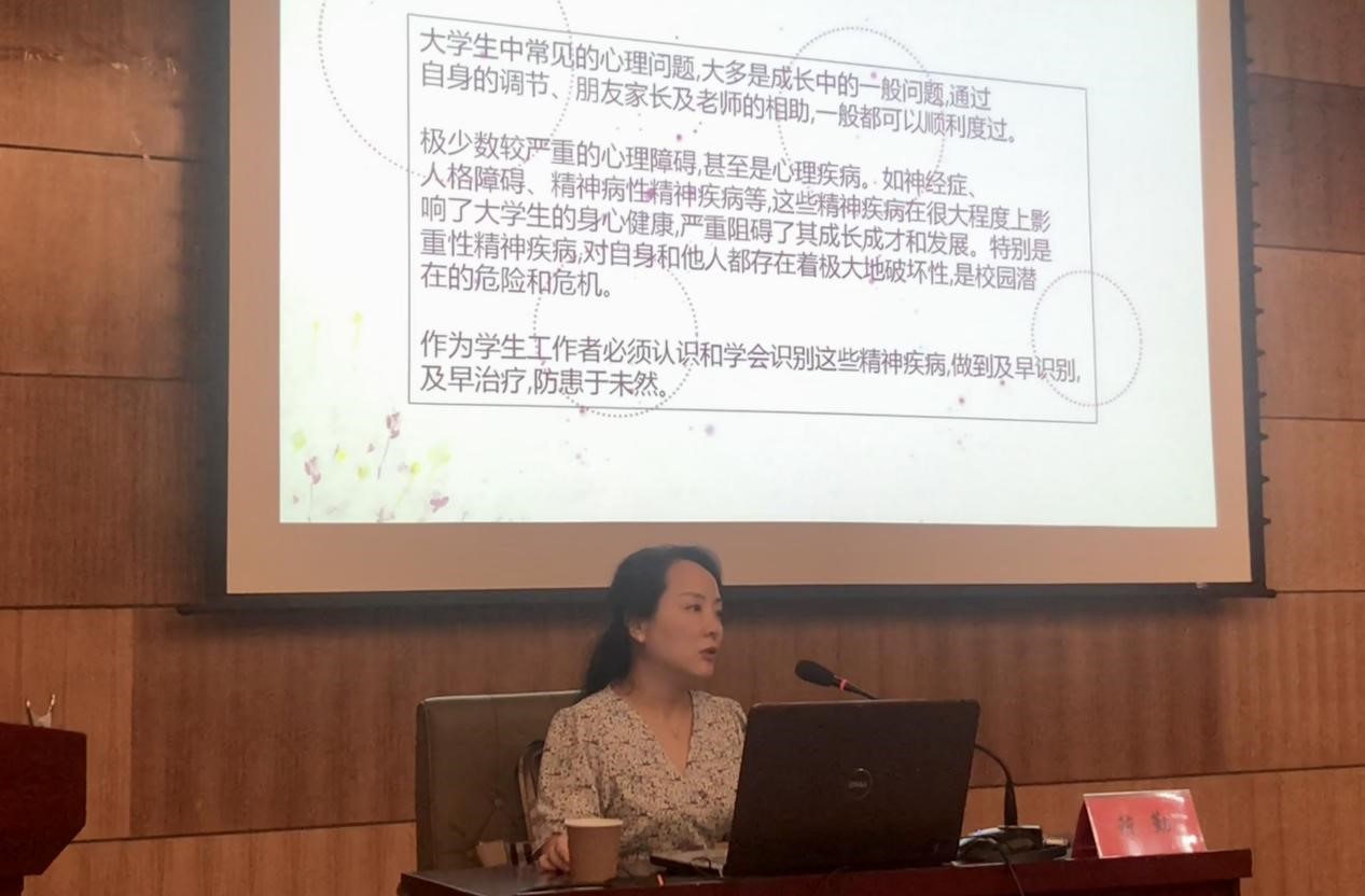陈勤围绕高校常见精神障碍的识别、会谈技巧、风险评估、自我关爱几个方面展开讲座。她首先讲到,大学生中常见的心理问题,大多是成长中的一般问题,通过自身的调节、朋友家长及老师的相助,一般都可以顺利度过。极少数较严重的心理障碍,甚至是心理疾病。如神经症、人格障碍、精神病性精神疾病等,这些精神疾病在很大程度上影响了大学生的身心健康,严重阻碍了其成长成才和发展。特别是重性精神疾病,对自身和他人都存在着极大地破坏性,是校园潜在的危险和危机。作为教师和学生工作者必须认识和学会识别这些精神疾病,做到及早识别,及早治疗,防患于未然。