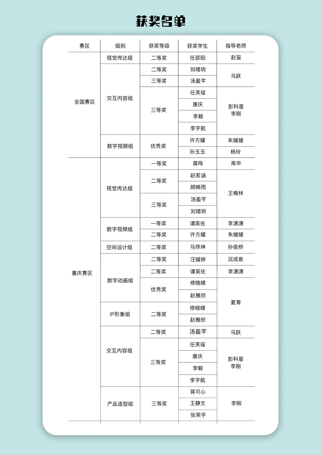 2021年11月,设计学系师生在第15届中国好创意暨全国数字艺术设计大赛及重庆赛区中囊括多项等级奖项。在数字视频组、空间设计组、视觉传达组等七个组别中获得2项一等奖、8项二等奖、5项三等奖、3项优秀奖。