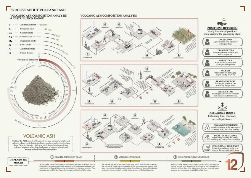 蒋帅同学的作品从自然灾害所引发的生态及产业不可持续问题出发,融合多学科知识,从设计学科角度给出了可行的解决方案。
