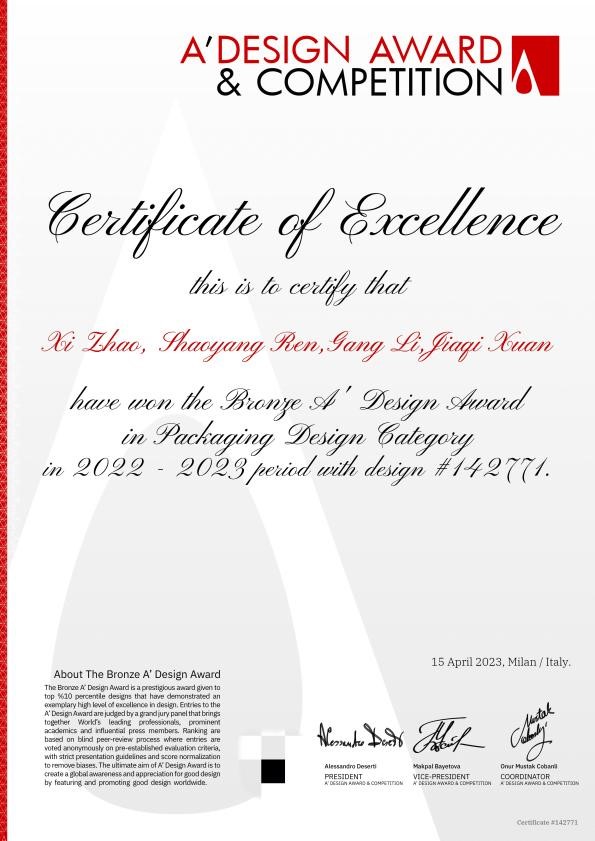 团队所提交的非遗文创礼盒作品《Kite Packaging》在众多优秀作品中脱颖而出,赢得A' Design铜奖奖杯。本作品来源于团队在非遗文化艺术领域十余年的长期深耕和积累。本次设计围绕潍坊风筝非遗资源进行文创开发,突破传统图形创意设计思维,结合风筝元素融入糕点实物、互动体验与视觉叙事三个维度分层创新,调动视觉、触觉、味觉等对传统文化记忆的感官呼应并贯穿整个纪念品礼盒设计,满足消费者在鉴赏纪念、参与制作、品味鉴赏等方面的不同需求,展现出兼具现代新奇与传统东方韵味的设计审美追求。团队在设计中尝试对内容和形式进行解构重组,以非遗礼盒纪念品为载体实现了对潍坊风筝文化的激活,体现出了文化自信与人文关怀。