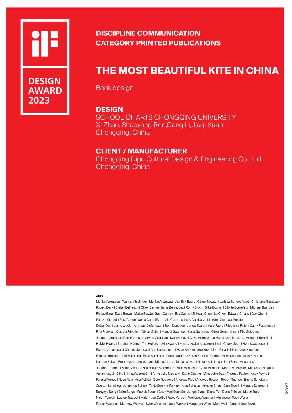2023 年 iF设计奖共有来自 56 个国家/地区的近 11,000 件参赛作品,来自 20 多个国家的 132 位设计专家们经过共同审视后,赵玺团队提交的书籍设计作品《中国最美风筝》,获得132位国际评委的青睐,赢得iF设计奖。