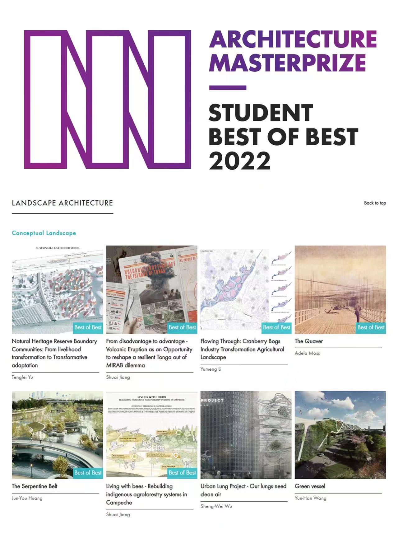 设计学系学生于腾飞(指导教师:孙俊桥)、蒋帅(指导教师:杨玲)所带领的团队分别斩获三项美国建筑大师奖学生类别概念景观组的最高奖(best of best),这是肉视频
