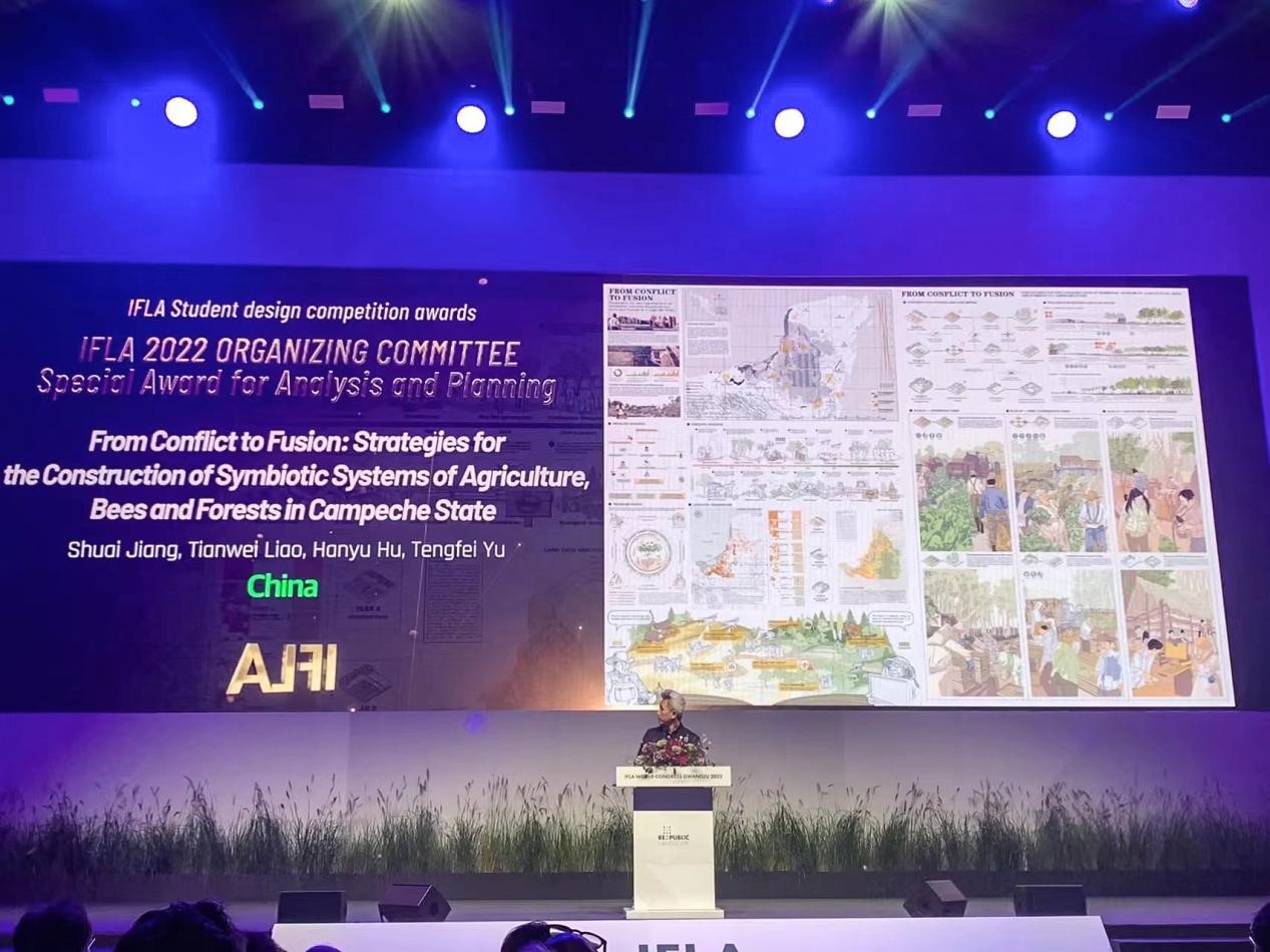设计学系学生蒋帅、廖天威、胡翰宇、于腾飞组建的参赛团队(指导教师:杨玲、孙俊桥)斩获IFLA 2022 组委会分析与规划特别奖(Organizing Committee Special Award for Analysis and Planning),该竞赛今年在全球仅发放九个获奖名额,肉视频