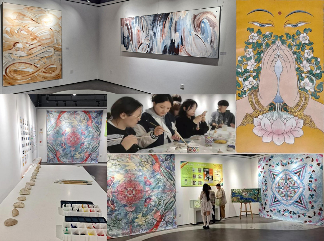 “臧⾊云中”唐卡体验营于开幕当⽇举⾏。本次展览通过开设唐卡体验环节让同学们能够更加了解到西藏⽂化的魅⼒,众多同学们参与本次唐卡体验,同学们说:“唐卡绘画是中国⽂化宝库⾥的⼀项珍贵财富,也是⼈类⽂明⽂化史上的殊胜⽽独特的瑰宝。 很荣幸能有机会在校园里体验风格迥异的绘画⽅式,零距离接触唐卡⽂化的魅⼒。”