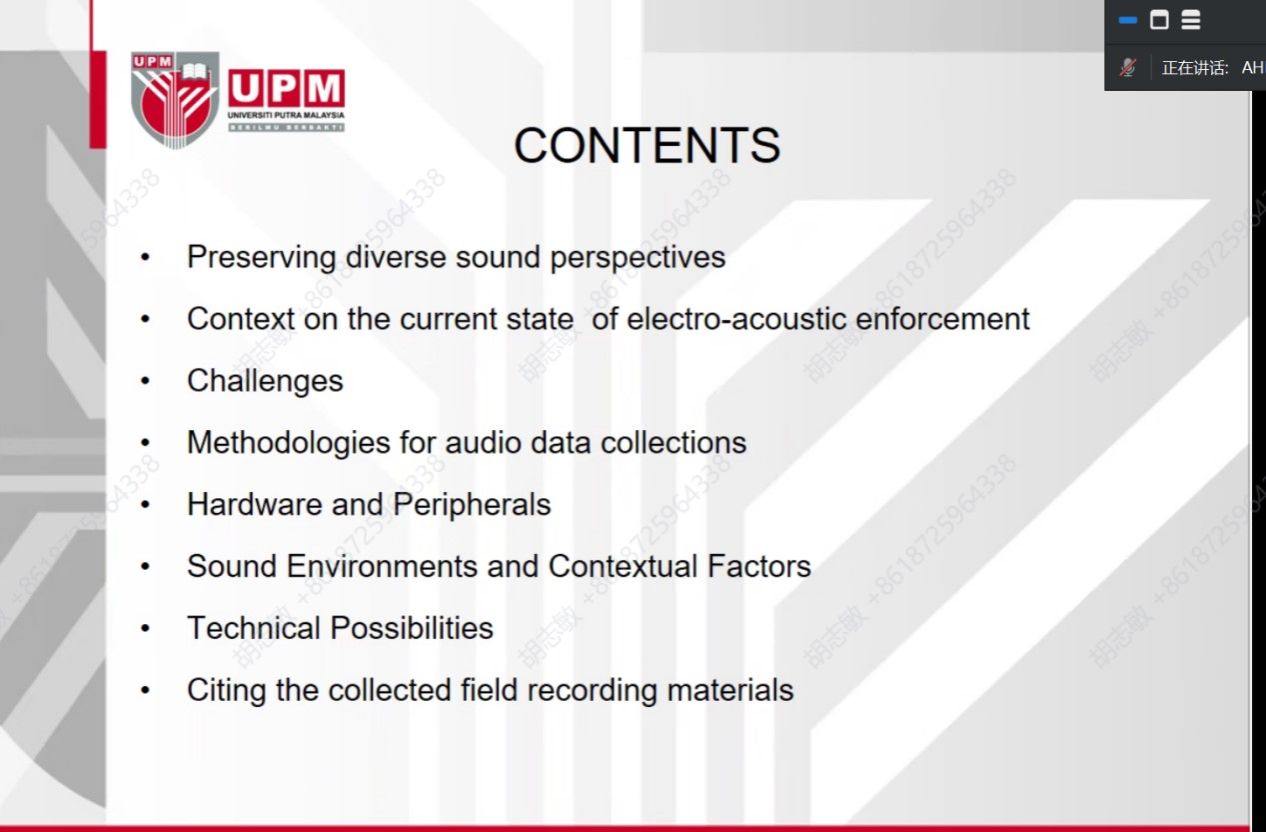 主讲人Ahmad Faudzi Musib为马来西亚博特拉大学音乐系原主任、副研究员,曾在美国伯克利音乐肉视频 、迈阿密大学和马来西亚博特拉大学学习。他专注于音频与录音艺术学,主要研究领域包括田野声音采集和实录,是马来西亚音乐产业研究的知名学者。