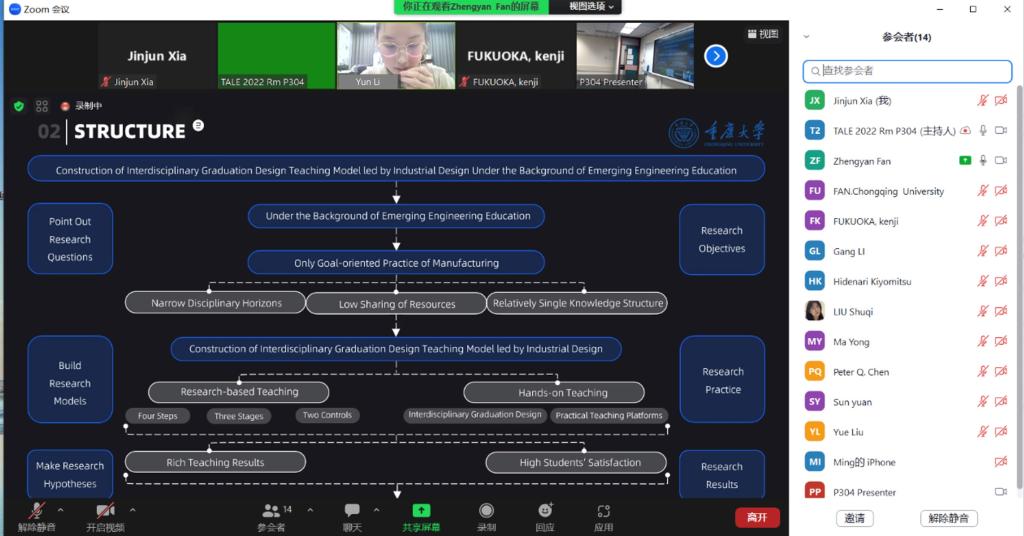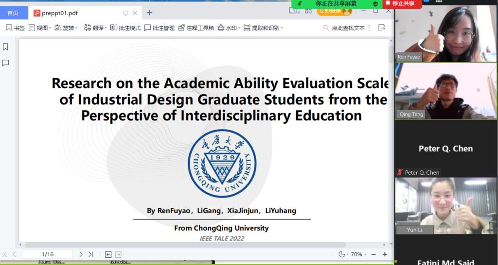 设计学系范正妍副教授、李刚副教授和夏进军副教授带领研究生团队参加IEEE TALE 2022国际学术论坛并与会进行了三场论文汇报,设计学研究生任符瑶、李赟、唐庆同学分别代表团队在线进行了分享。