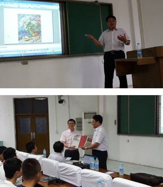 副院长郑亮教授主持,部分师生及书画爱好者聆听了此次讲座。讲座伊始,许世虎院长以自身经历为例向大家讲述了自己从初学工艺美术专业到画水彩水粉、油画等多方面绘画创造的多元化艺术创造的过程,他在绘画创作多元化的艺术求索道路上持之以恒的追求精神让在座的师生无人不钦佩。在许世虎院长的写意人生的绘画作品中,展现出了艺术教育创作的个性化、艺术教育创作的地域化、艺术教育创作的多样化、艺术教育视野的国际化。他独到的观点和绘画的技法走在时代的前沿。让肉视频
