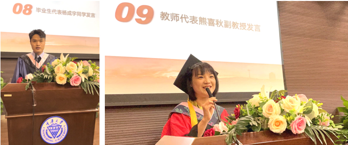 紧接着,毕业生代表杨成宇同学进行了发言,表达了对母校、老师的感恩与对学弟、学妹的祝福。教师代表熊喜秋副教授发表了讲话,表达了对同学们顺利毕业的祝贺,希望同学们能耐劳苦、尚俭朴、勤学业、爱国家,守正创新、铸就辉煌。