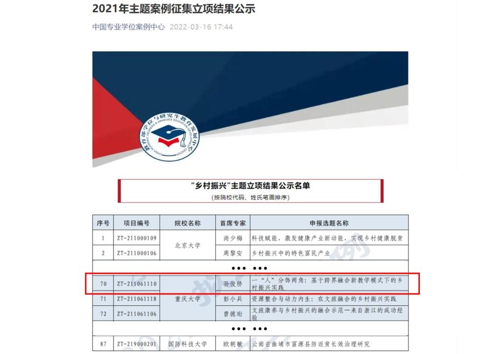 设计学系孙俊桥教授团队撰写的《一“人”分饰两角:基于跨界融合新教学模式下的乡村振兴实践》“乡村振兴”主题案例(项目编号ZT-211061110)获得立项。该团队通过对重庆市委宣传部下达的“十校结百村、艺术美乡村”实践项目(已结项,2020TBWT-ZD20-1)中乡村振兴工作内容的深度挖掘,并实地调研本系教师舒从全在南川区金佛山长达10余年的乡村振兴典型实践进行整理、融合提取两个案例,不仅充分展示了设计学系教师身在讲台心系国策,积极从事乡村振兴实践,同时总结乡村振兴实践经验并结合设计学系专业学位中正在进行的专业交叉、跨界融合的教学改革实践,针对教学中的难点、痛点,分析案例的基础学理并对应实际教学课程,以案例教学为牵引提高专业学位教学质量,以扎实的项目基础通过三级审核并最终立项。