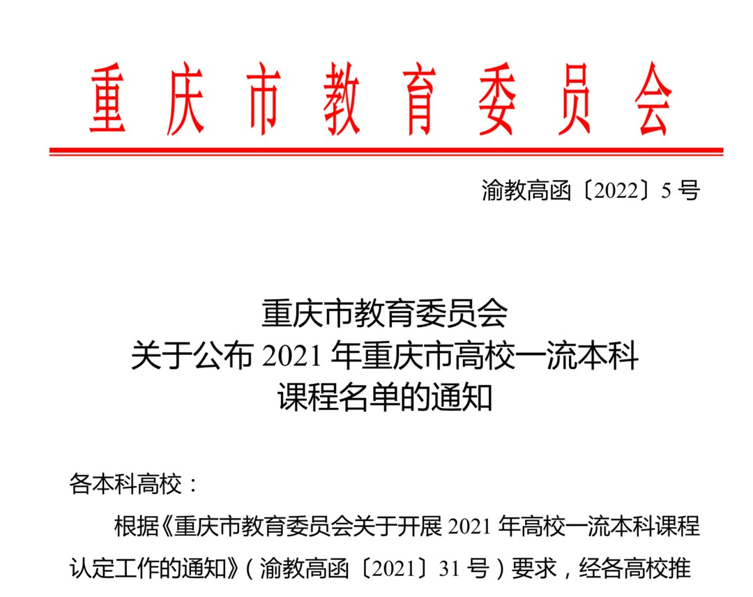 近日,重庆市教育委员会发布《重庆市教育委员会关于公布2021年重庆市高校一流本科课程名单的通知》(渝教高函〔2022〕5号),肉视频