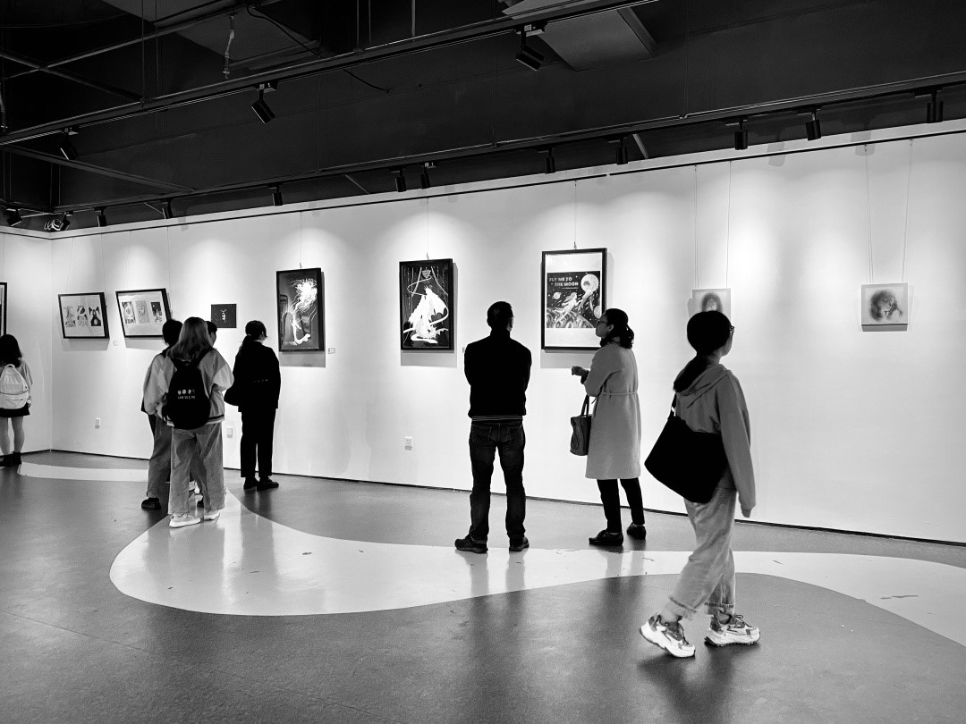 展览开始后,观众络绎不绝 ,纷纷走进展厅,一同感受插画带给人的乐趣。视觉传达专业的同学们在为期四周的课堂中尝试运用传统绘画、数字技术等方式进行创作,成果精彩纷呈。当艺术与数字技术相遇,冰冷的技术变得鲜活,艺术的边界得到延伸。