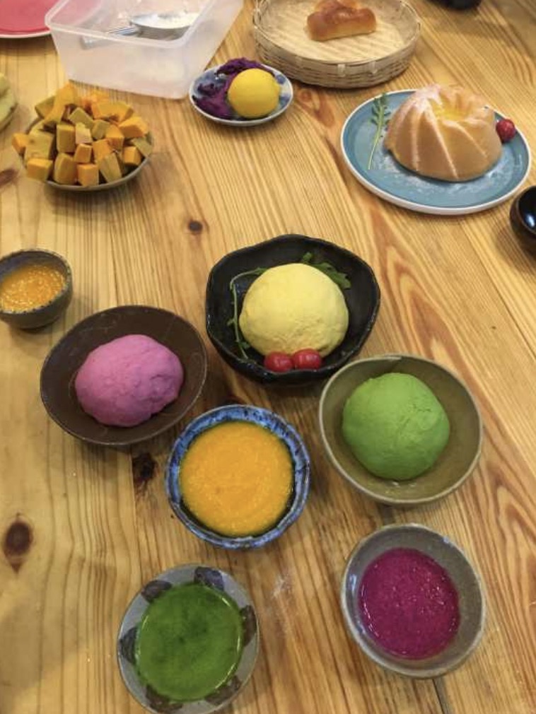 接着同学们在小白老师指导下分别用南瓜,红色火龙果,菠菜为原材料制作出黄,红,绿三种颜色的彩色馒头,并用来自德国的机器制作特殊的南瓜汤,玫瑰柠檬汁和秋葵鸡蛋羹。同学们个个开动脑筋,两两组队,自己动手制作了一餐丰盛的下午茶。女生们更帮忙挑选了合适的食器以配餐,下午茶可谓色香味俱全。最后小李老师端出新鲜出炉的法棍面包和做三明治的培根、蔬菜等。同学们亲自动手制作美味三明治当作晚餐主食。