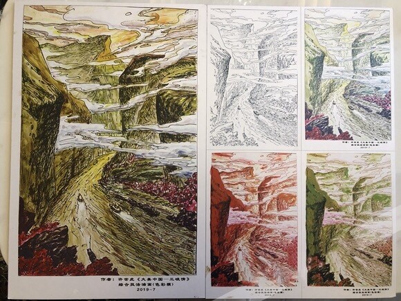 在创作初期,许世虎教授设定了有五六张《大美中国·三峡情》的色彩稿小样,仅是这幅画的主色调,许世虎教授前后就换了四五种,包括绿色、红色,最终确定了金色。