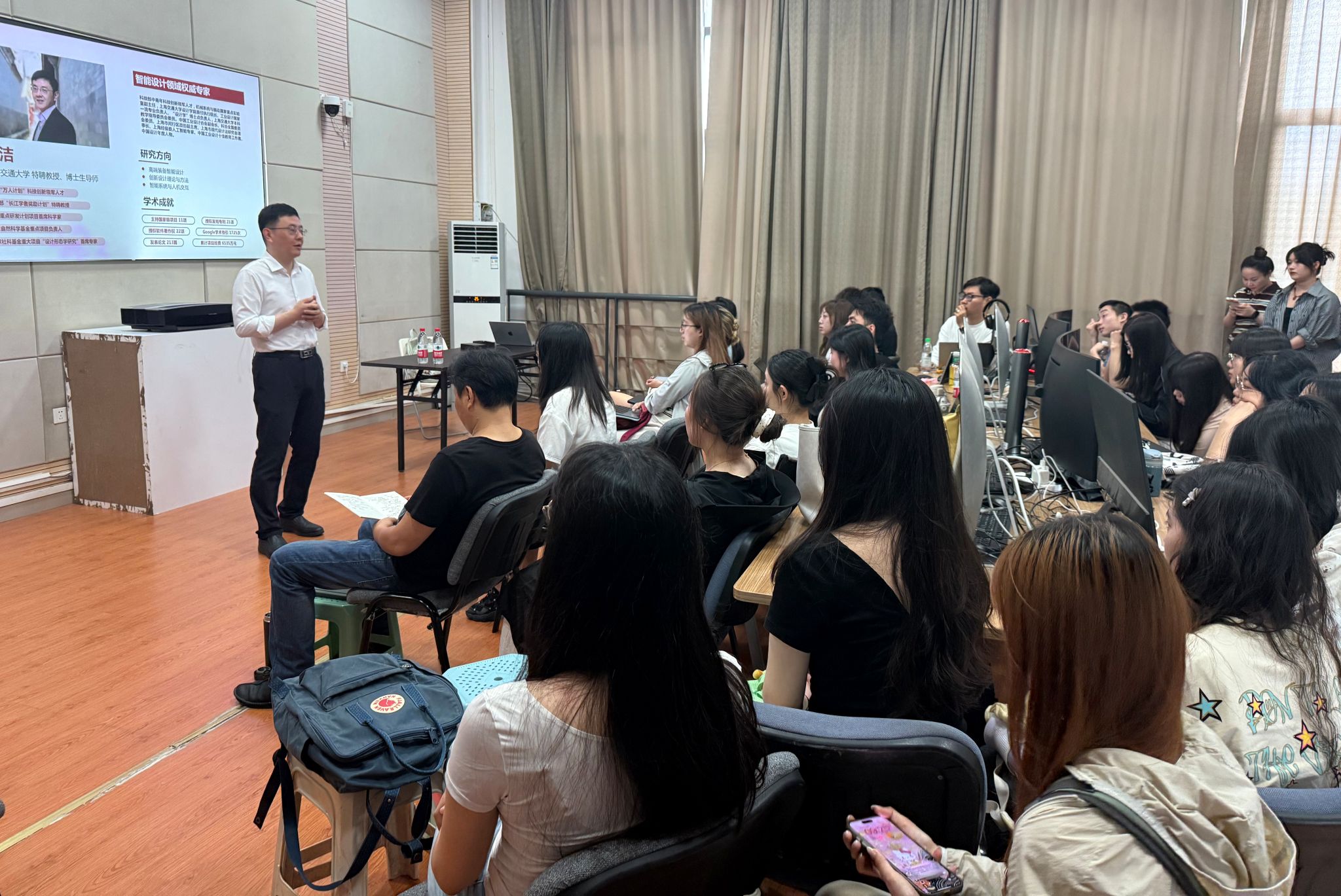 培训中,胡洁教授针对设计学交叉学科领域的前沿技术、研究方法和学科趋向进行了系统的介绍,并为大家梳理了设计学SCI论文写作的核心要素,覆盖创新选题挖掘、研究方法设计、写作难点攻克以及期刊投稿策略等多个环节。来自创新设计研究院的闫星云博士和方明珠博士分别结合团队承担课题和选题范例,分享了具体的研究设计与科学论文写作技巧。该次培训基于理论方法、案例分析和人因实验设备操作实践,围绕论文框架构建、实验设计、数据采集及结果分析等关键环节对与会师生进行全面指导,帮助大家了解和初步掌握基于科学研究范式的设计学论文写作。师生们还就学术研究与论文写作中的各种问题进行了深入交流,现场学术氛围浓厚。