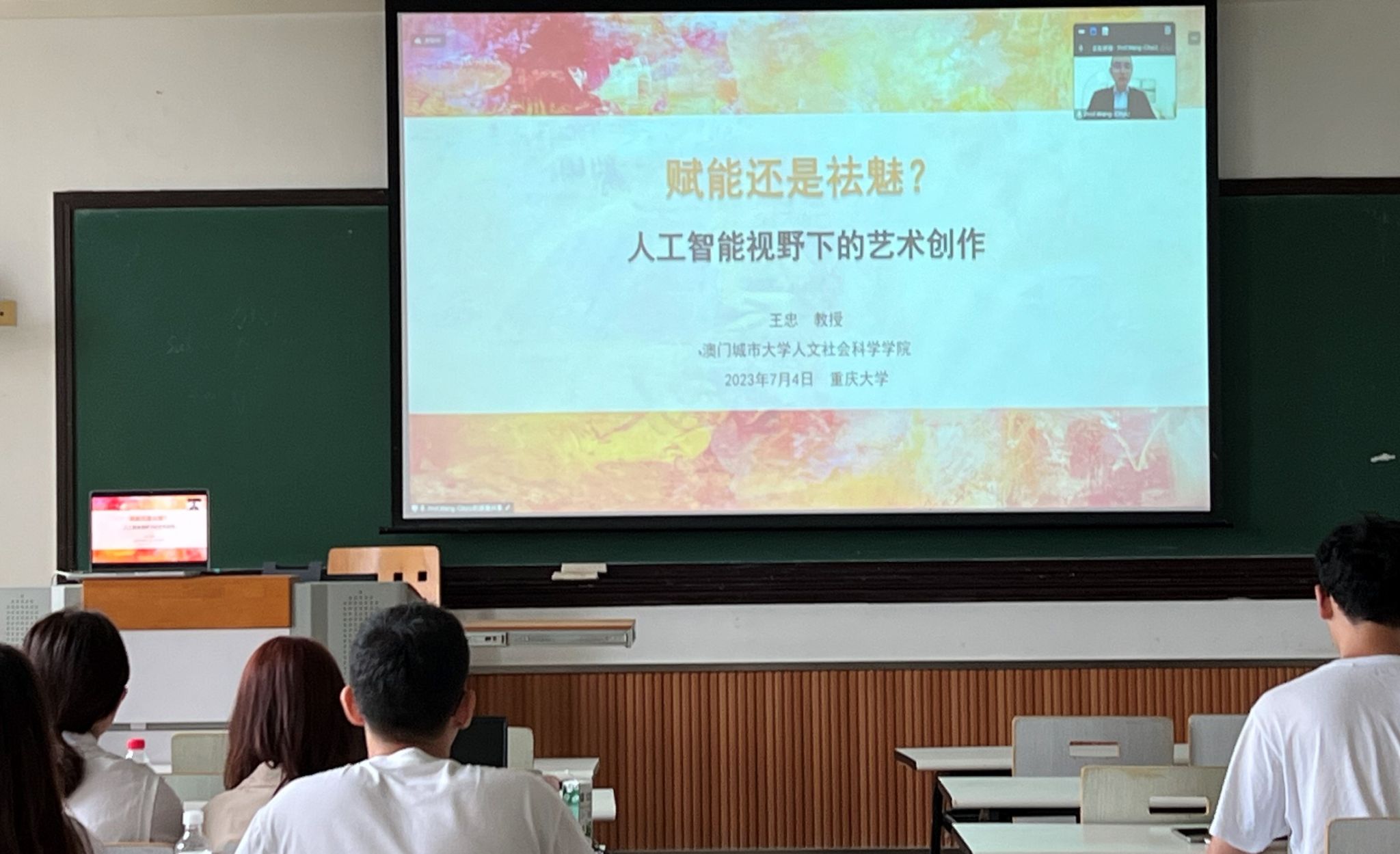 王忠教授就人工智能艺术创作中的科技哲学与伦理反思进行了分享,引导同学们对智能科技在艺术创作“赋能”与艺术作品“祛魅”两极间产生的牵引作用及其后果进行了深入思辨和讨论。
