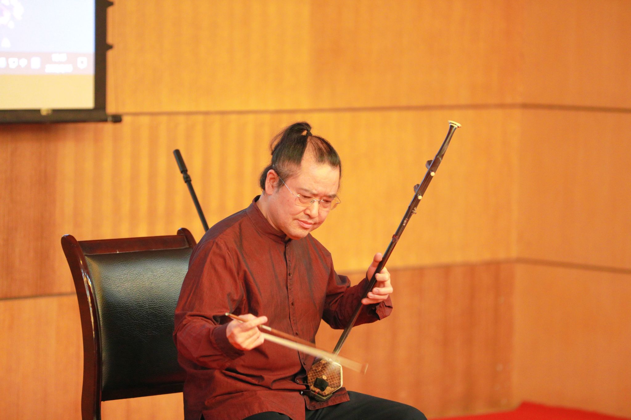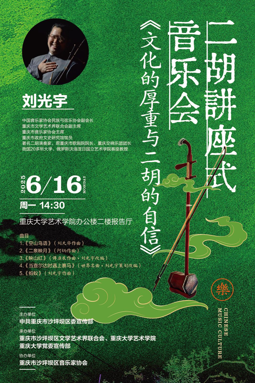 刘光宇系中国音乐家协会民族弓弦乐协会副会长,重庆市政府文史研究馆馆员 ,著名二胡演奏家 ,重庆市歌剧院原院长、重庆交响乐团原团长。同时,担任我国 20 多所大学、俄罗斯沃洛涅日国立肉视频 等高校客座教授。音乐会现场,刘光宇以“文化的厚重与二胡的自信”为主题,通过对作品《空山鸟语》(刘天华作曲)、《二泉映月》(阿炳作曲)、《映山红》(傅庚辰作曲、刘光宇改编)、《当查尔达时遇上赛马》(卞留念作曲、刘光宇策划)、《蚂蚁》(刘光宇作曲)的讲解和诠释,将中华文化和二胡艺术的厚重性和当代性,以时间为链条,以乐曲为故事呈现给现场观众。一场别开生面的二胡讲座式音乐会为师生们带来了一场视听与文化交融的盛宴!