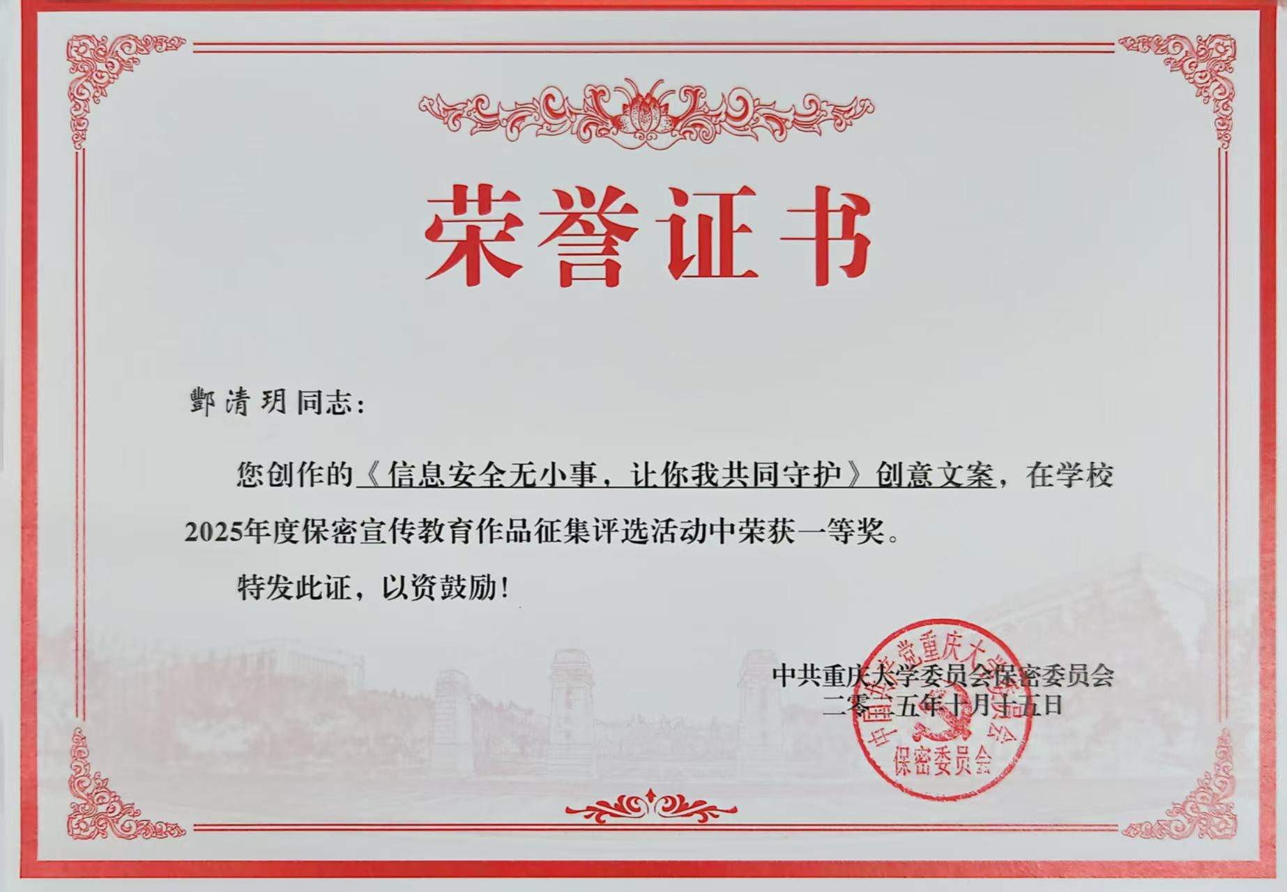 酆清玥同学的作品《信息安全无小事,让你我共同守护》荣获一等奖;袁节同学的作品《贯彻落实保密法,你我都是护密人》和尹兴欣同学的作品《保护国家机密,共同筑牢保密防线》分别荣获二等奖;蒋梓歆,谢雨芯,吴虹雨,汪媛婷和赖怡霖等5名同学的4件作品分别荣获三等奖;陈思怡、韩钰同学的2件作品分别荣获优秀奖。