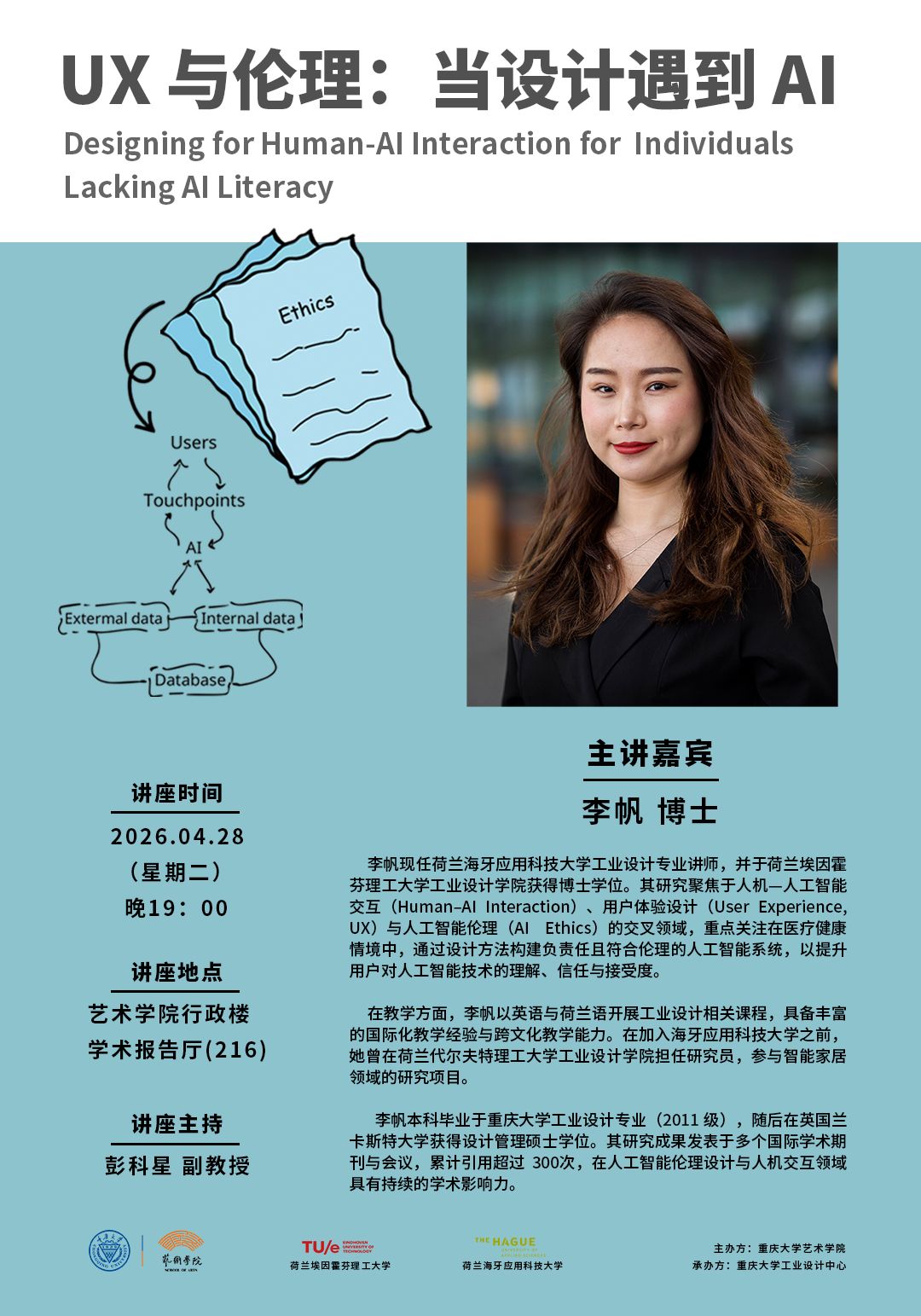 行政楼学术报告厅(216)举办校友学术讲座《UX与伦理:当设计遇到AI》。