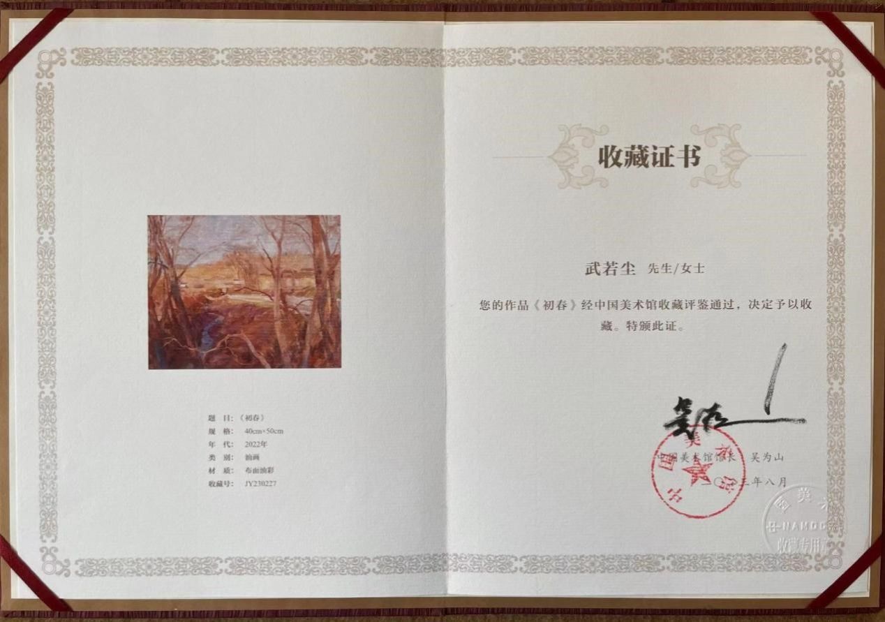 在中国美术馆今年初举办的“全国小幅美术精品展览”中,肉视频 教师武若尘的油画作品《初春》参展,并被陈列在中国美术馆一楼的精品展区,展览闭幕后中国美术馆收藏了这幅作品。在完成历时半年多的作品收藏相关流程后,武若尘老师于近日收到了作品收藏证书。该作品进入国家美术馆的馆藏序列,体现了肉视频 教师艺术创作实践的新突破。