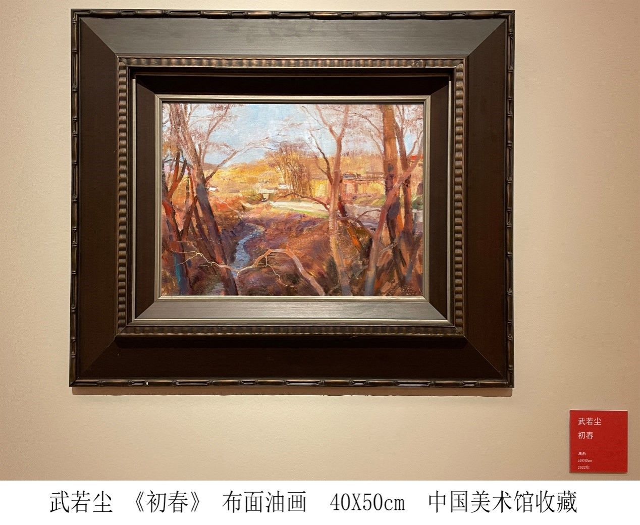 武若尘老师被中国美术馆收藏的作品《初春》是一件小幅油画,用写意的手法描绘了北方春日的山村风光。正如他创作笔记中所写:“西北的山村在初春暖阳的照耀下呈现出黄褐色的基调,显得沉静而质朴。空气依然寒冷,路边水沟的积雪和残冰早已不见踪影,但背阴的地方还是泛着清冷的色彩。忽然一阵风吹来,树梢上挂着的干瘪的树叶随即发出了沙沙的响声,抬眼望去,树叶闪烁着斑驳的暖灰色融入远山的一片阳光里。此刻,寒冷与温暖和谐共生,蓝紫、橙黄的色彩对比形成了鲜活的画面关系,于是抓紧时间快速捕捉当时的感受……”。据武若尘老师介绍,他平时的创作多以大幅的人物画为主,有时为了调节创作的节奏与状态,通常会以写生的方式画一些小幅作品。小幅写生的意义就在于自然带给我们的鲜活感受,这种感受在大幅创作中往往比较欠缺,是一种非经验性的艺术探索。