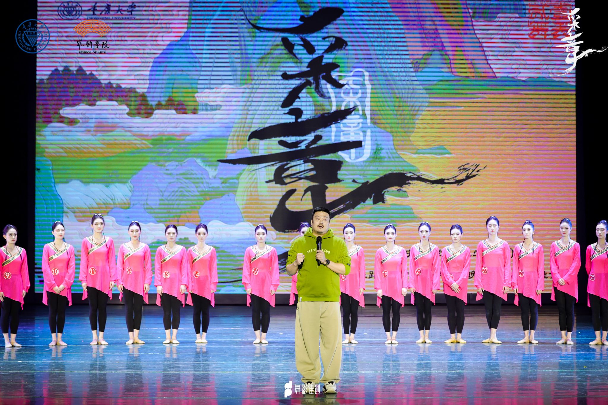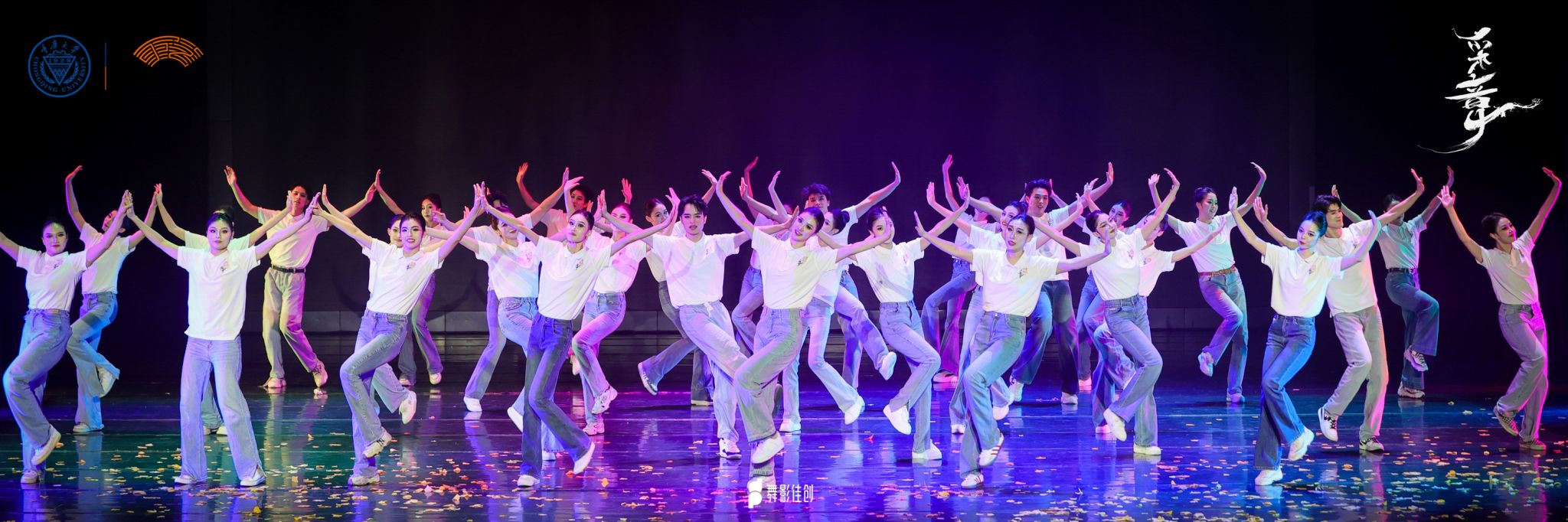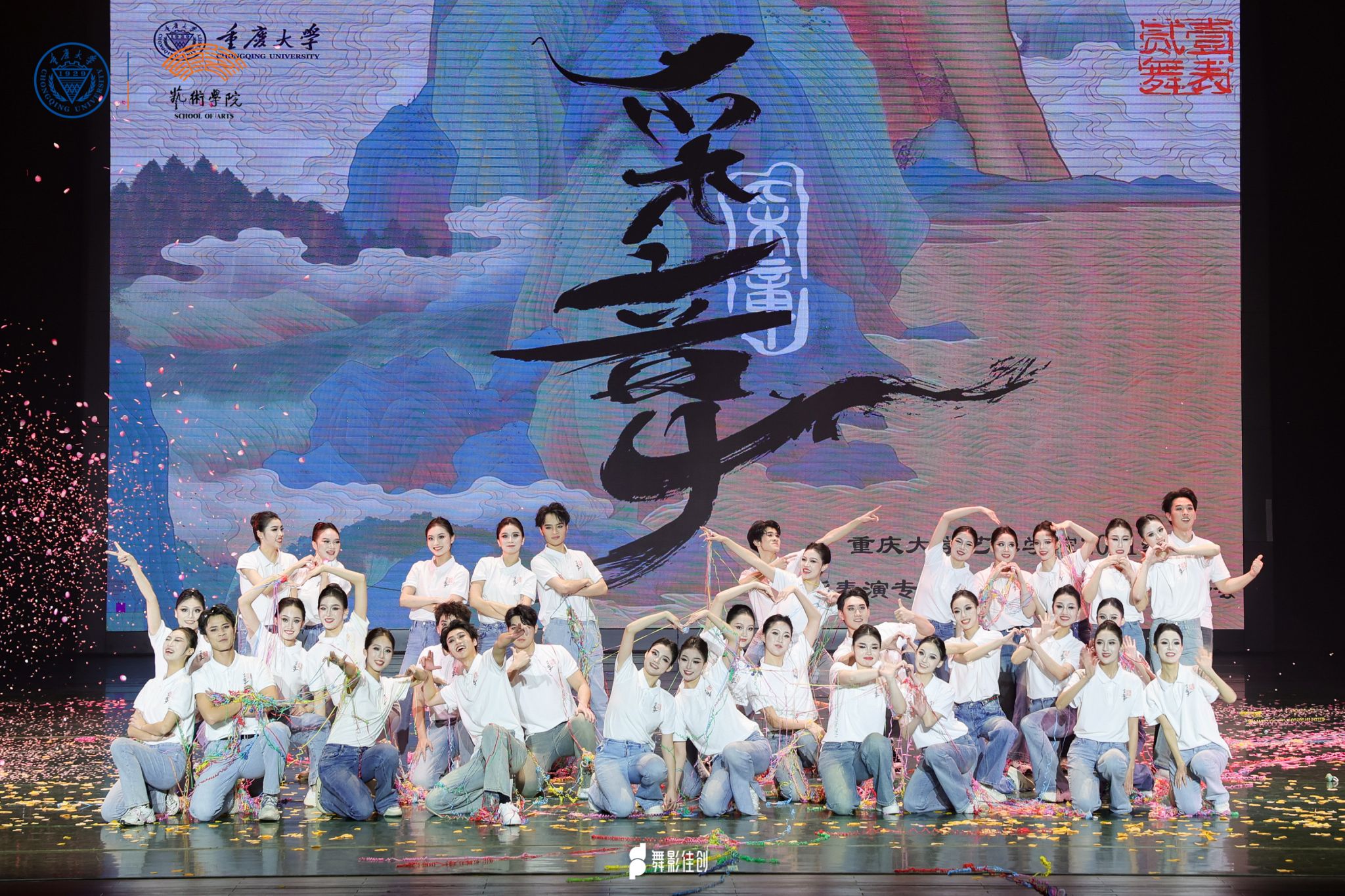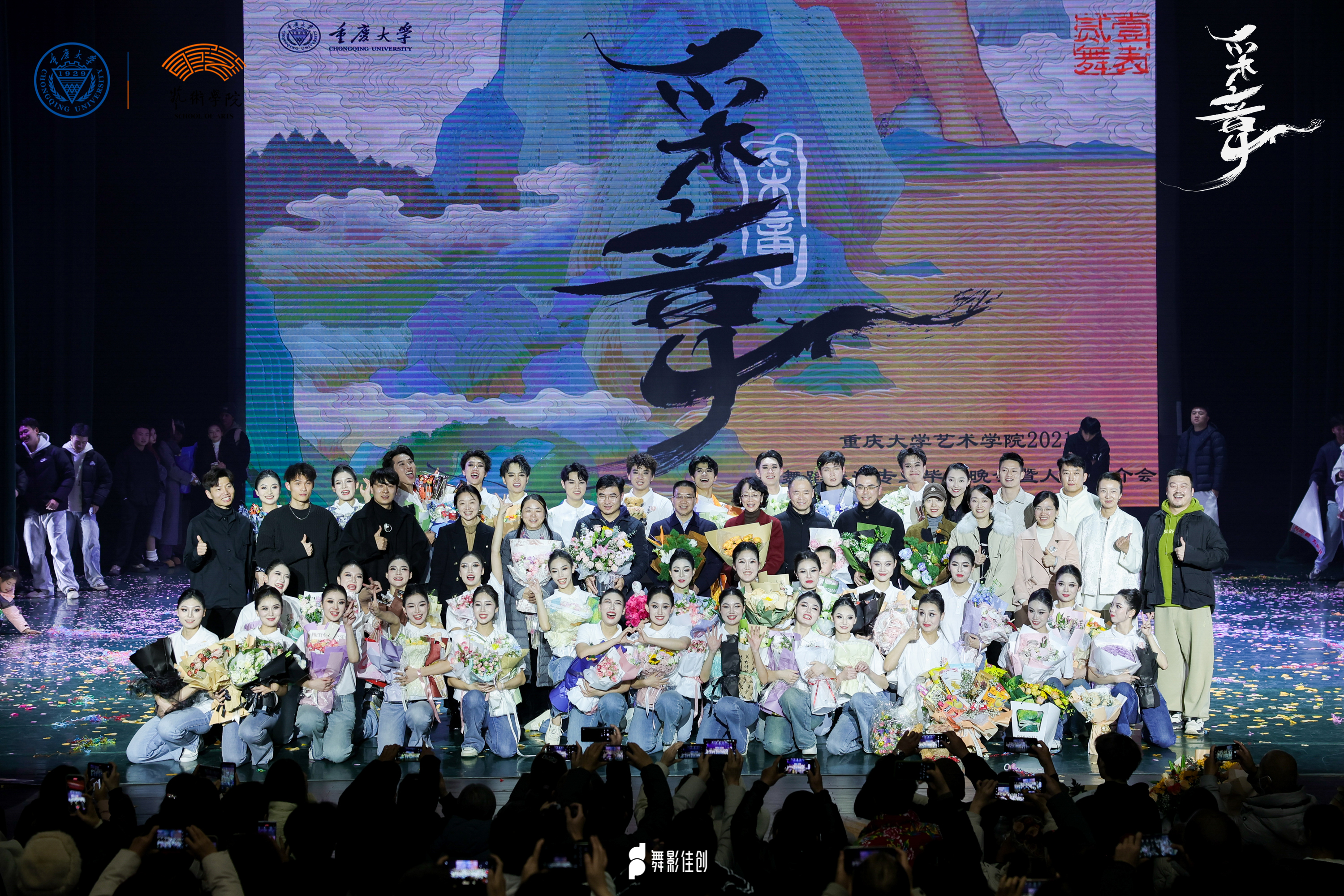 在璀璨的灯光与激动人心的旋律中,“采章”毕业晚会在指导教师和2021级全体学生的共同努力下,以“发采章”“凌云志”“凤鸣阳”“归去来”四个篇章依次展开,分别从中国古典舞基训、民族民间舞、舞蹈剧目、尾声四部分,全方位展示了同学们四年来的专业学习成果以及老师们的教学成果。同学们用力与美交织,挥洒出无尽的激情与创造力,尽情演绎着他们多年来的心血与坚持。现场气氛热烈,掌声不断,所有人都为这群舞者的青春与梦想而动容。