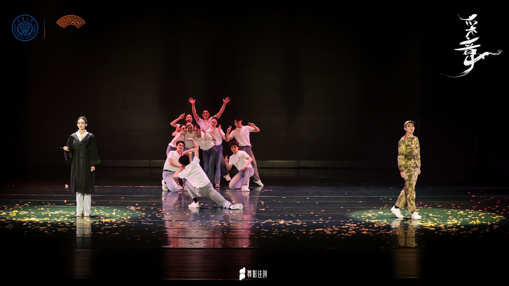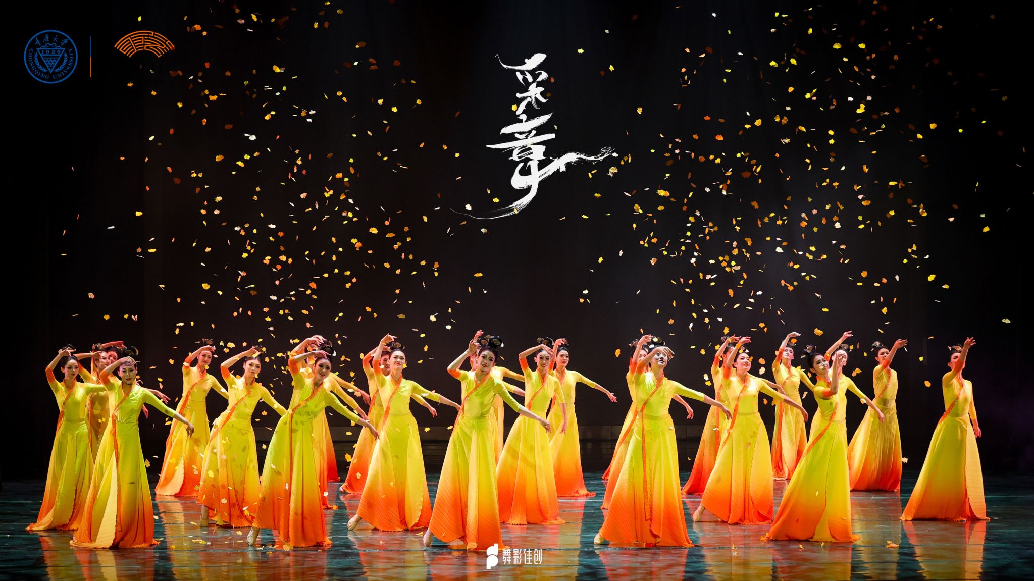 山川的广袤与雾霭的神秘,以现代舞特有的抽象和象征方式,呈现出人与自然之间的和谐与冲突,人与自我之间的迷失与觉醒;鼓点激昂的节奏,伴随着舞者们激情四溢的舞姿,传递出奔放与自由的气息,诉说着彝族人民对故土深深的礼赞; “从来银杏不负秋,如画山河任君游”,纷纷飘落的银杏叶将整场晚会推至高潮,她们从容静美、充满活力,如同生生不息的银杏,一树风华。