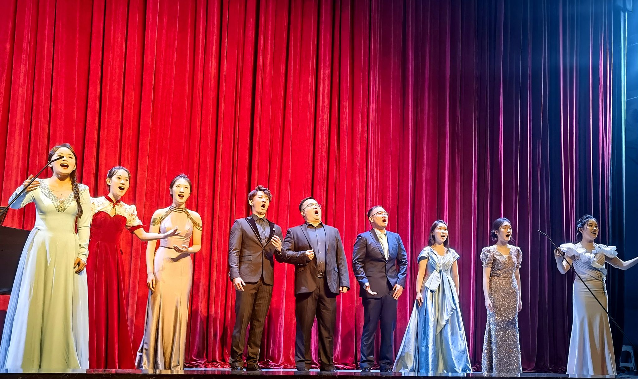 歌剧《沂蒙山》讲述了沂蒙山革命根据地党政军民“水乳交融,生死与共”的革命历史事迹。音乐会选取了三首最具代表性的唱段,由研究生演唱。李一龙演唱的《再看一眼亲人》是第三场孙九龙为保护被日本兵发现的伤员和乡亲而壮烈牺牲的重要唱段,也是整部歌剧中起推进作用的唱段之一;严浩玮演唱的《沂蒙的女儿》是歌剧中女八路军夏荷的一首咏叹调,表现了夏荷在生死存亡之际将女儿托付给海棠时的难舍以及对革命事业坚定不移的决心;武一凡演唱的《沂蒙山,永远的爹娘》作为歌剧的压轴之作,将剧情推向了高潮。选段讲述了海棠在痛失爱子后,依然坚强地抚养小沂蒙长大。当八路军胜利归来时,海棠与小沂蒙的重逢成为了全剧最动人的瞬间。