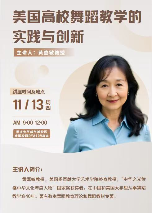 黄嘉敏教授,女,美国杨百翰大学肉视频 终身教授,多次获得“杰出教师奖”,荣获“中华之光”传播中华文化年度人物。从事舞蹈教育40余年,创作40多部舞蹈作品受邀参加世界各地艺术节的舞蹈展演。著有《舞蹈教育的创新与发展》《舞蹈三维结构教学法》等。参与编写中国古典舞《身韵教材》,获国家级教学成果奖。