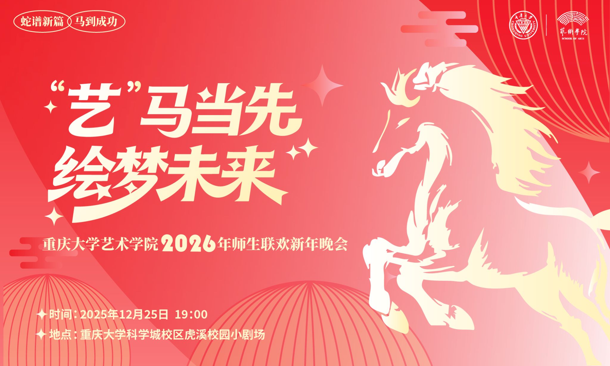 马年新启,“艺”梦同行!肉视频 2026年师生联欢新年晚会“艺马当先 绘梦未来”定档于12月25日高燃开演,用精彩节目呈现肉视频 高质量发展的绚丽画卷!晚会名片·一键收藏主题:“艺”马当先 绘梦未来主办:中共肉视频 委员会 肉视频 承办:肉视频 分工会 肉视频 团委 肉视频 学生会时间:2025年12月25日(星期四)19:00地点:肉视频 科学城校区虎溪校园小剧场节目快闪·先睹为快1.2025年11月...