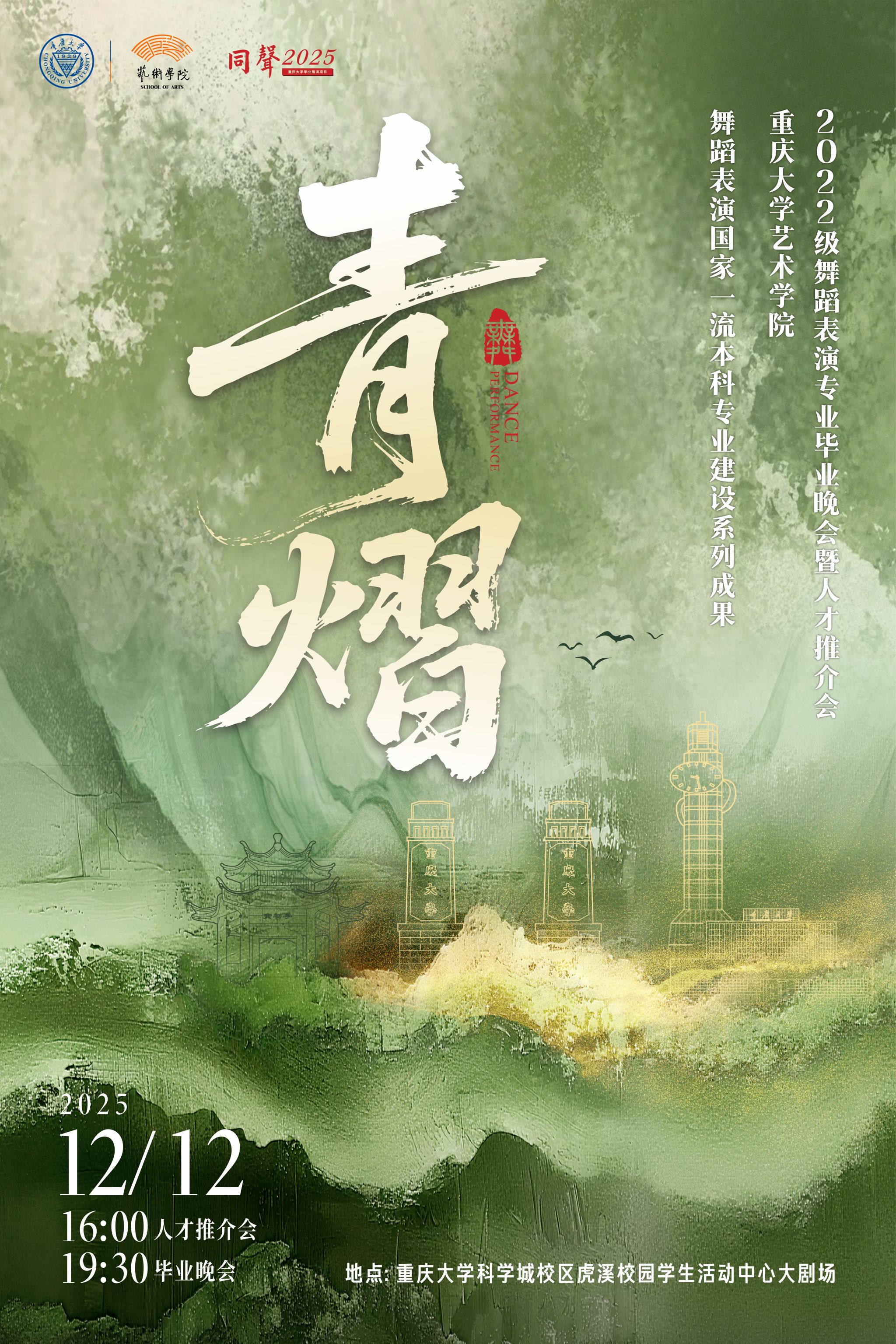重庆大学党委宣传部“同声2025”系列活动之一、“廿五华章·舞铸一流”——重庆大学舞蹈表演专业国家级一流本科专业建设点成果展示暨舞蹈系建系25周年纪念晚会将于1月8日在重庆市劳动人民文化宫举行,诚挚邀请您莅临指导,与我们同贺华章、共叙发展。宣传视频