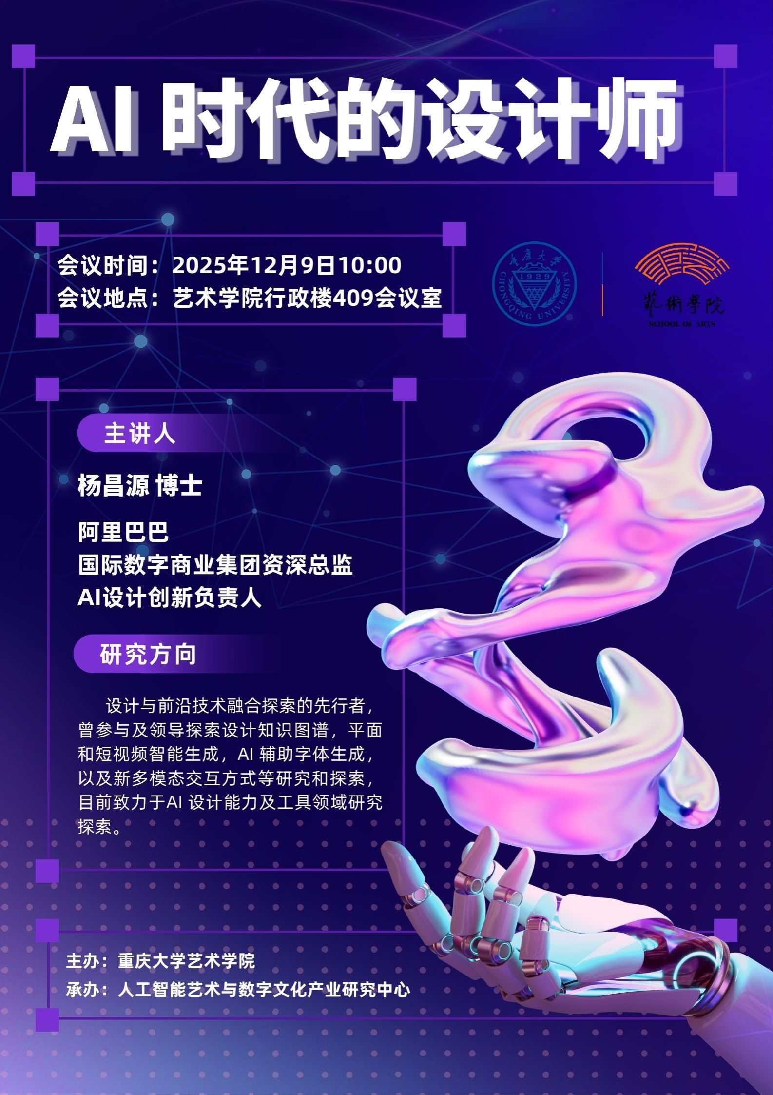 2025年12月9日上午,“AI时代的设计师”专题交流活动在艺术学院办公楼第三会议室举行。本次活动特邀阿里巴巴国际数字商业集团资深总监、AI设计创新负责人杨昌源博士担任主讲嘉宾,艺术学院副院长夏进军、人工智能艺术与数字文化产业研究中心主任李刚、副主任夏青以及师生代表参与了此次活动。杨昌源聚焦人工智能技术对设计行业与教育带来的深刻变革,通过专题分享与座谈交流两种形式,为学院师生搭建了高质量的对话平台。在...