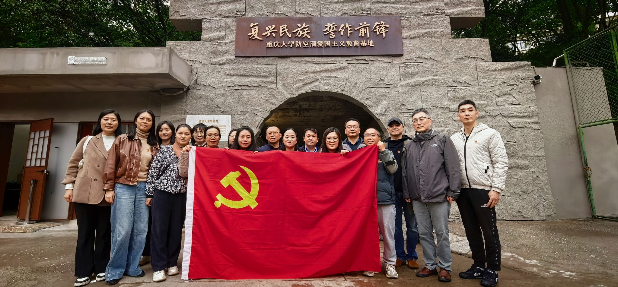 为深入学习贯彻习近平新时代中国特色社会主义思想,弘扬伟大抗战精神,增强党员教师的历史使命感与爱国主义情怀,2025年11月6日下午,重庆大学艺术学院行政教工党支部与设计学系教师党支部联合开展“复兴民族,誓作前锋”主题党日活动,到位于沙坪坝校区A校园的重庆大学防空洞爱国主义教育基地参观学习。活动伊始,参加活动党员在防空洞入口处合影留念,面对“复兴民族,誓作前锋”的庄严题刻,重温初心誓言,坚定理想信念。...