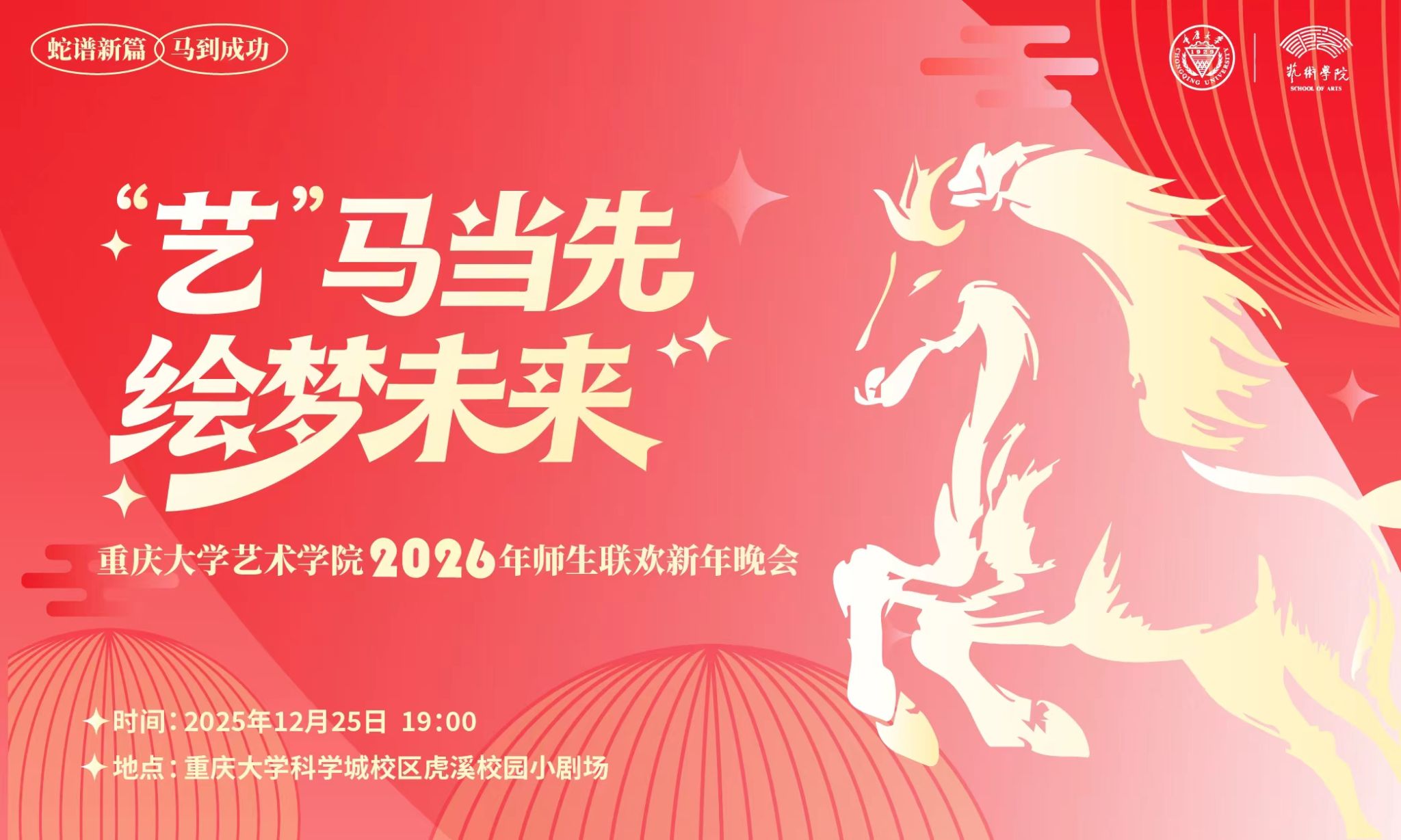 活动详情预告,抢先看!“艺”马当先 绘梦未来 重庆大学艺术学院2026年师生联欢新年晚会今日正式发车