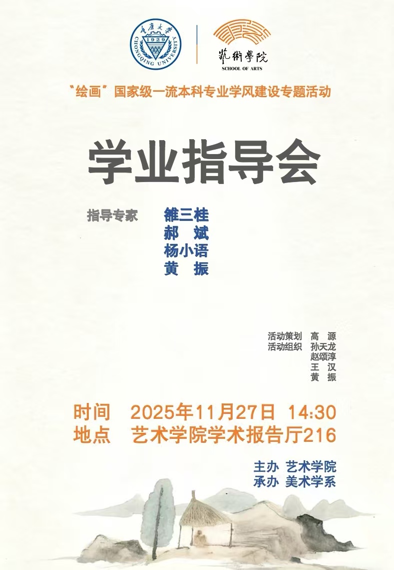 2025年11月27日下午,由重庆大学艺术学院主办、美术学系承办的“学业精进·专家引领成长计划”学风建设活动在学院学术报告厅顺利举行。本次活动由美术学系副主任高源策划,班主任孙天龙、赵颂淳、王汉、黄振联合组织。艺术学院院长张楠木、美术学系教师及各年级学生参加了此次活动,活动由孙天龙主持。此次活动邀请了美术学系教授雒三桂、美术学系主任武若尘、副主任王汉、副教授郝斌、杨小语以及青年教师代表黄振担任指导专家,...