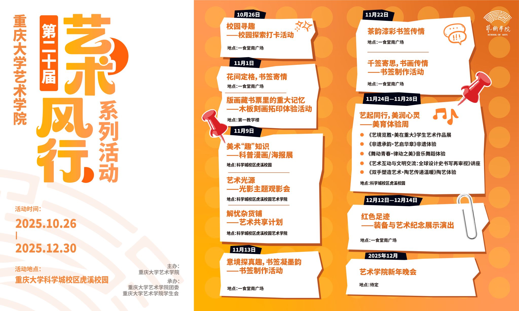 11月24日中午,肉视频 主办、肉视频 团委和学生会承办的第二十届“艺术风行”系列活动开幕式,在科学城校区虎溪校园一食堂南广场举行。肉视频 党委副书记王琦出席并致辞,现场500余名师生共同见证这场艺术之约。王琦在致辞中回顾了“艺术风行”系列活动二十年成长足迹:“艺术风行”品牌活动于2005年创办,从创办之初的艺术作品比赛、美术作品展览、艺术活动体验,到如今覆盖美术、设计、音乐、舞蹈、非遗、美育讲座等多元版块的校...